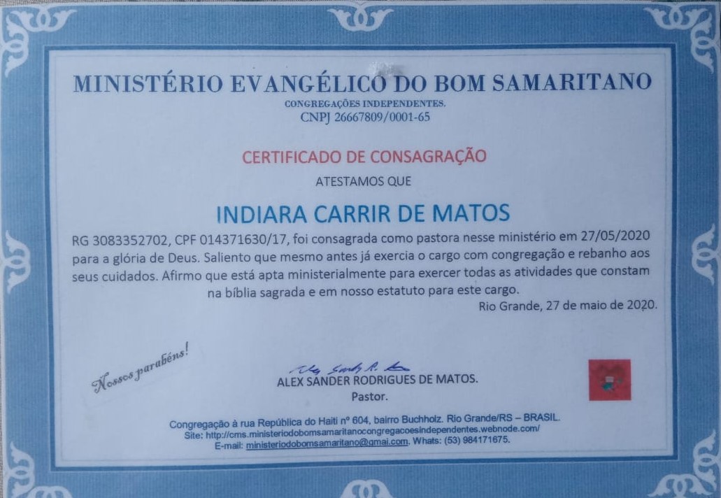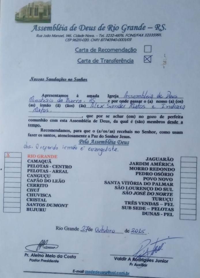 Passado um tempo, resolvemos voltar a congregar na Assembleia de Deus da Missão até o tempo em que Deus permitiu que saíssemos para viver os planos Dele de uma maneira particular. Contudo saímos com carta, oração e bênção do nosso ex-pastor (conforme carta abaixo) com o cargo de evangelista.