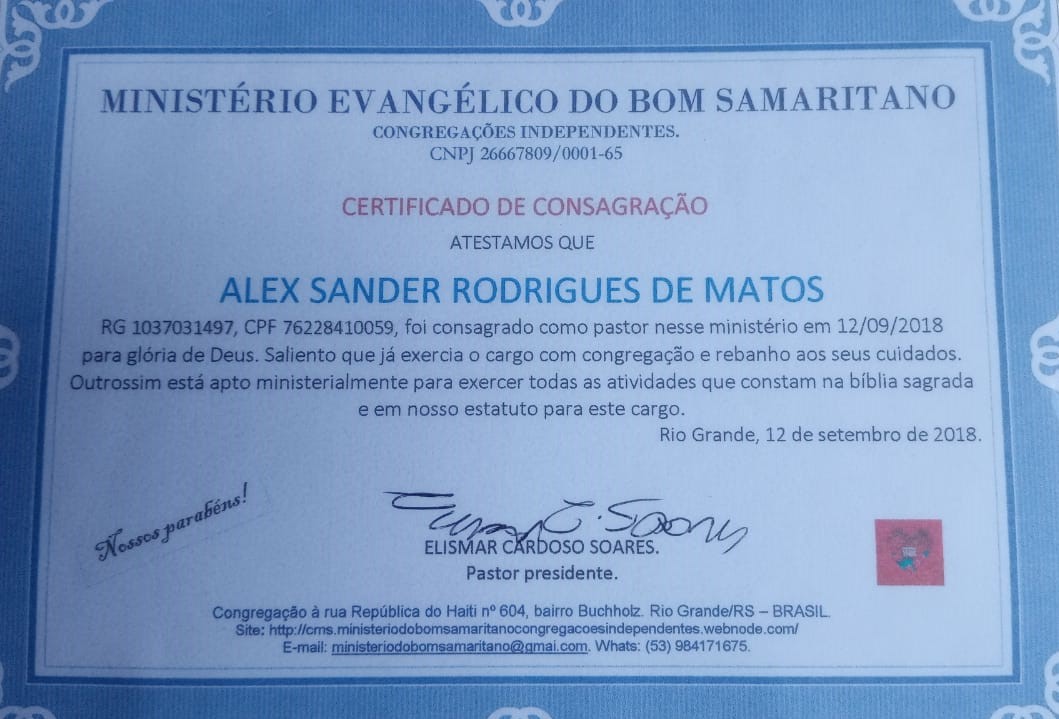 Com o passar do tempo e depois de muitas histórias e muitas bênçãos... o MINISTÉRIO EVANGÉLICO DO BOM SAMARITANO nasceu em 29/10/2015, dia em que fizemos o primeiro culto com esse novo nome. Quero explicar que o nome desse ministério foi dado por Deus na madrugada por revelação a um irmão (Josué) de um ministério co-irmão contou que, em sonho, ao passar em frente da minha casa, viu uma placa com o atual nome do ministério, e admirado ainda comentou com Deus que não sabia que tínhamos aberto uma 'igreja' mas até seria o nome certo porque gostamos de ajudar as pessoas. O que realmente até então estava só no 💗 de Deus. ALELUIA!